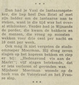 Brielle kende verder nog een lantaarnopsteker: (de) Vaal, welke met zijn ladder heel Den Briel afliep om de lantaarns aan te steken, en een stadsomroeper, ene Moerman. Mijnheer Moerman woonde op de hoek van de Voorstraat en het Franse Slop. Hij sloeg zeven slagen op het koperen bekken en riep erbij: “Hedenavond vis aan de Markt”; vijf slagen betekende, dat er iets verloren of gevonden was. Het betrof Jop Moerman, 23-12-1803/10-12-1891, verver en glazenmaker, huis/rijtuigschilder, omroeper.