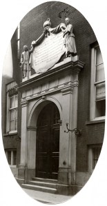 Boven de hoofdingang aan de Goudsewagenstraat, gebouwd in 1763, met twee gebeeldhouwde levensgrote figuren, voorstellende een weesjongen en een weesmeisje, die een grote draperie in de vorm van een wapenmantel ophielden, stond een gedicht van Jakob Kortebrant: